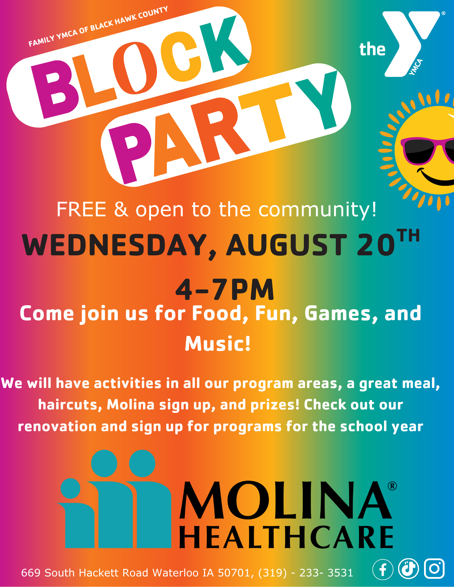 Please join us for our annual Summer Block party! There will be a community meal, games, and fun! We will be having FREE haircuts but you must pre register at blackhawkymca.org.Additional Info