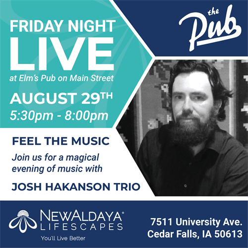 Friday Night Live! Get ready for another incredible evening with Josh Hakanson Trio on August 29th! Where: NewAldaya, Elms Pub on Main Time: 5:30 PM - 8:00 PM A huge thank you to our sponsor! Peters Construction Corporation Kick off your weekend with live music, great vibes, and unforgettable fun! See you there!