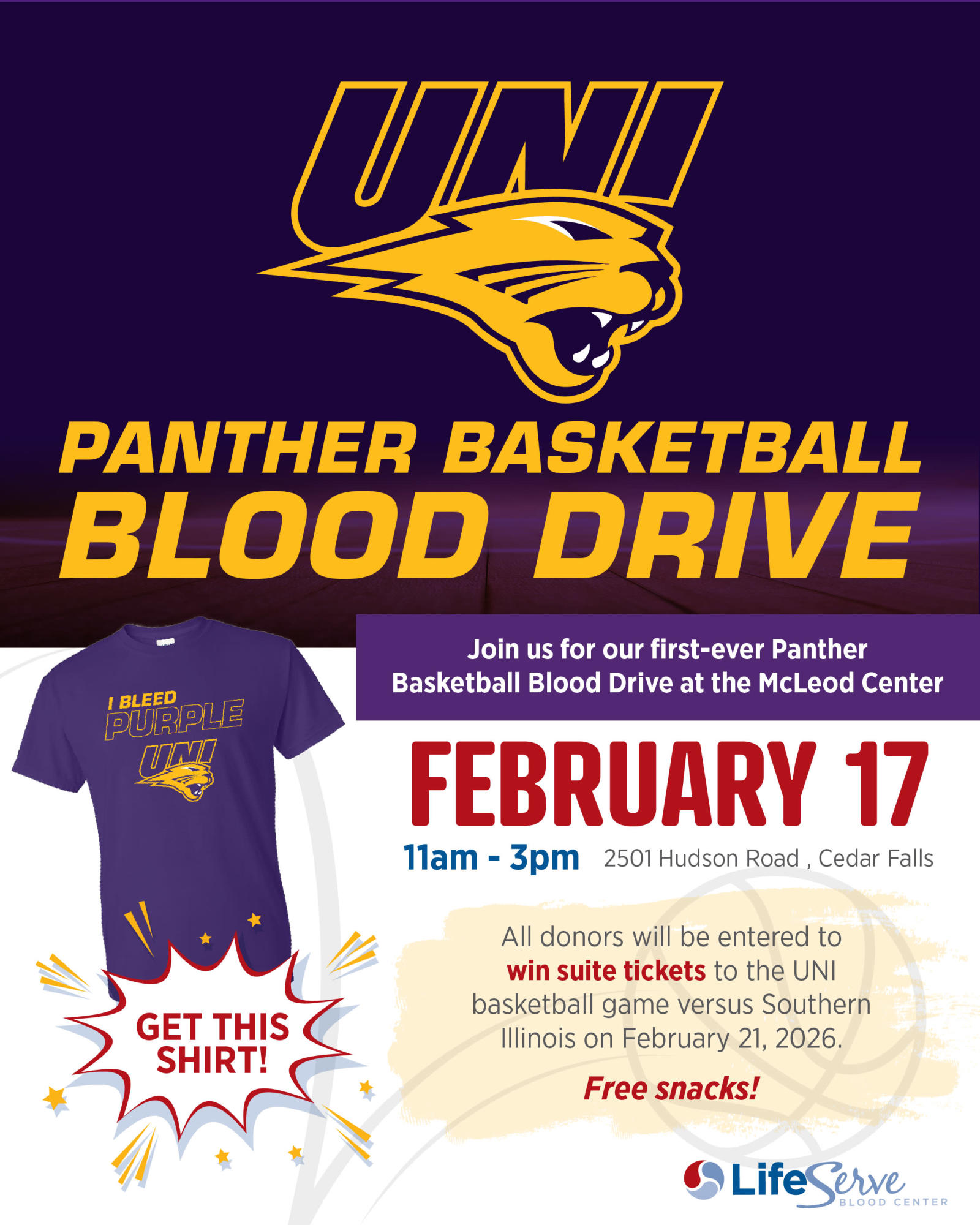 We’re hosting our first-ever Panther Basketball Blood Drive at the UNI-Dome in Cedar Falls on February 17, 2026. Donors will receive our exclusive “I Bleed Purple” T-shirt and be entered for chance to win suite tickets to the UNI basketball game versus Southern Illinois on February 21, 2026.