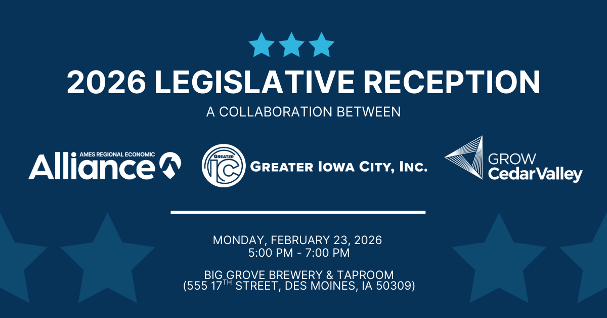 The Ames Regional Economic Alliance, Greater Iowa City, Inc., and Grow Cedar Valley are hosting a joint reception for legislators to increase awareness of our communities and the important role universities play in our local economies. Come and enjoy food and beverages, thank legislators for their service, and sample treats from each region.